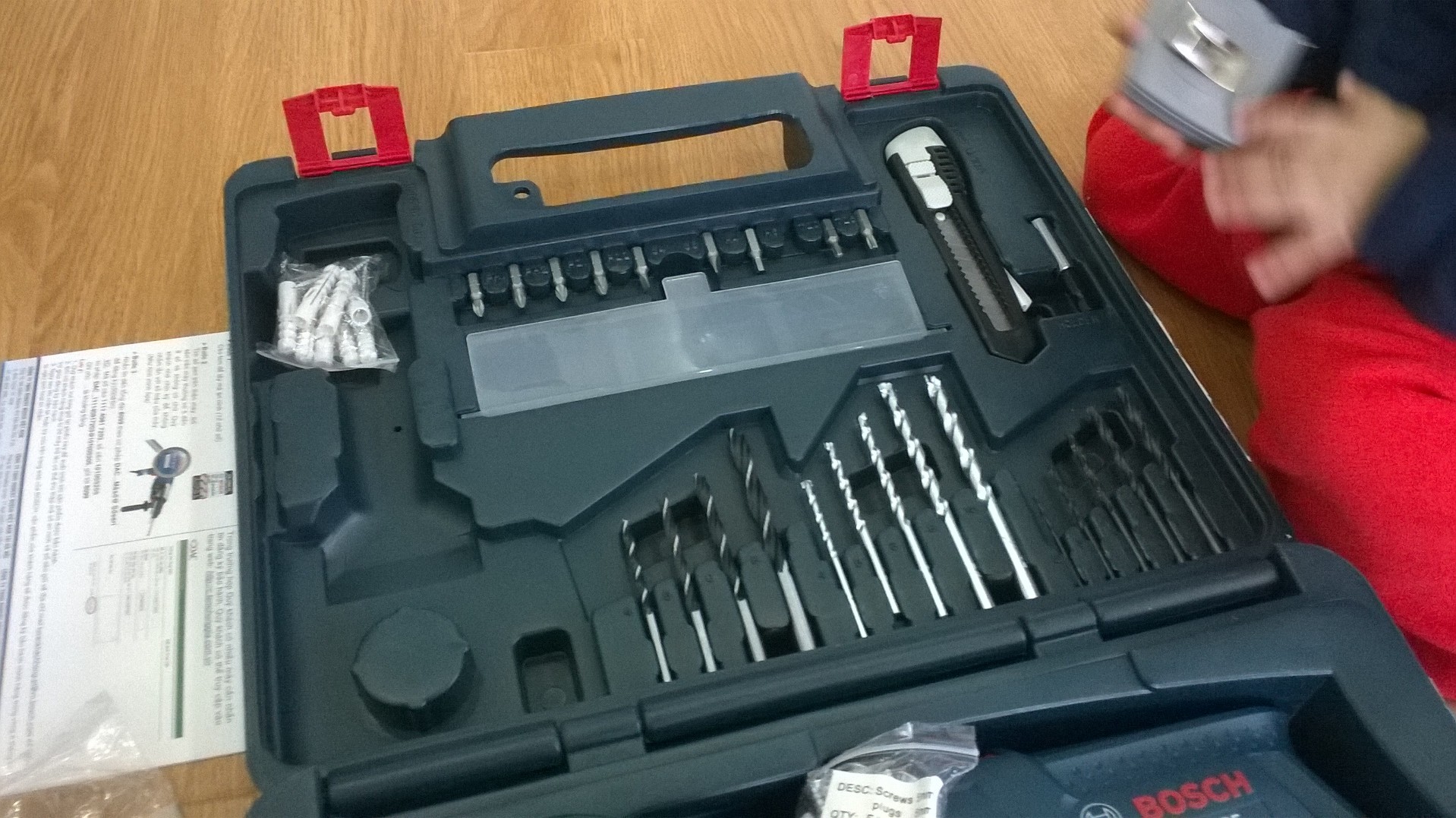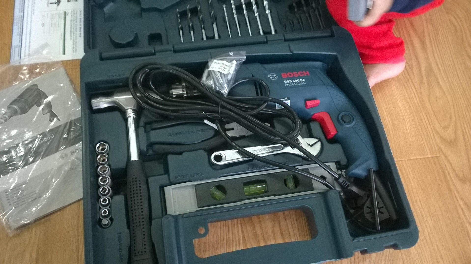 Khoan hơi bị yếu, không tài nào khoan được cái chậu rửa để lắp vòi lọc nước, đành đi khoan tường để lắp tivi, ấn hộc hơi rút cục cũng khoan thành công và lắp tivi lên tường. Coi như là hài lòng với cái khoan giá 1.2 triệu, kèm mũi khoan bê tông, gỗ, thép. Cùng các phụ kiện để vặn ốc, nhưng mình chưa có kinh nghiệm nên vặn bằng máy làm toét ngay một cái ốc :))
