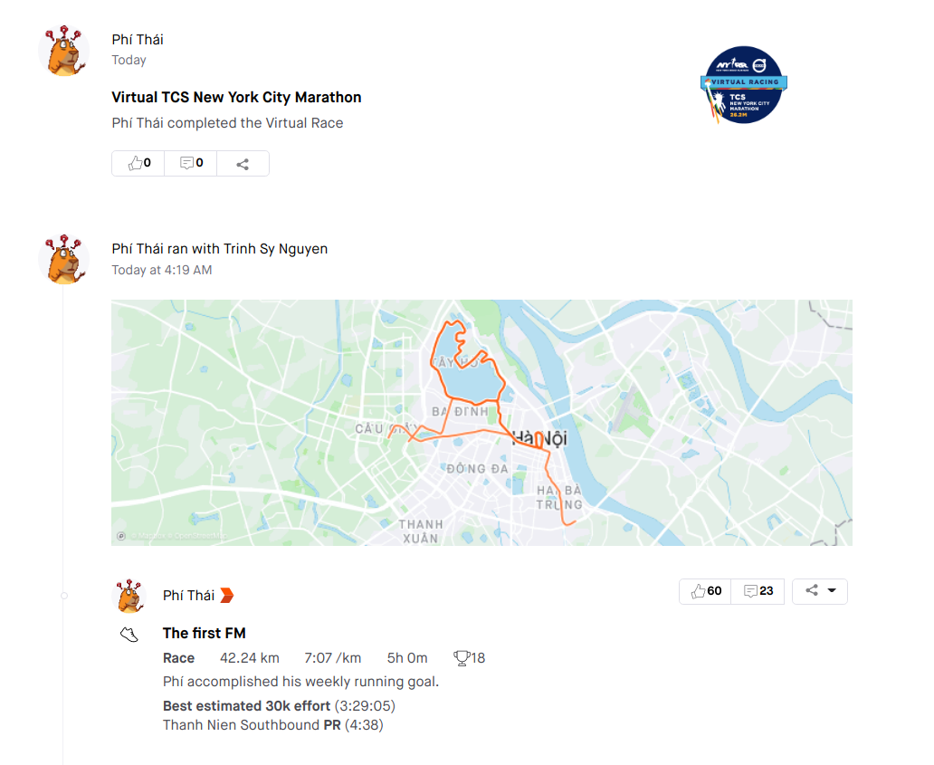 Nhân bẩu như thần bẩu, một vòng Hồ Tây xong vòng về nhà mình, vừa khít 42.2km. Tới cầu chỗ ngõ 381 Nguyễn Khang, mình tắt đồng hồ vì đã đủ km, và gọi grab – dù chỉ còn 800m nữa là tới nhà, nhưng lúc đó là chân mỏi lắm rồi, không muốn bước thêm một bước nào nữa.