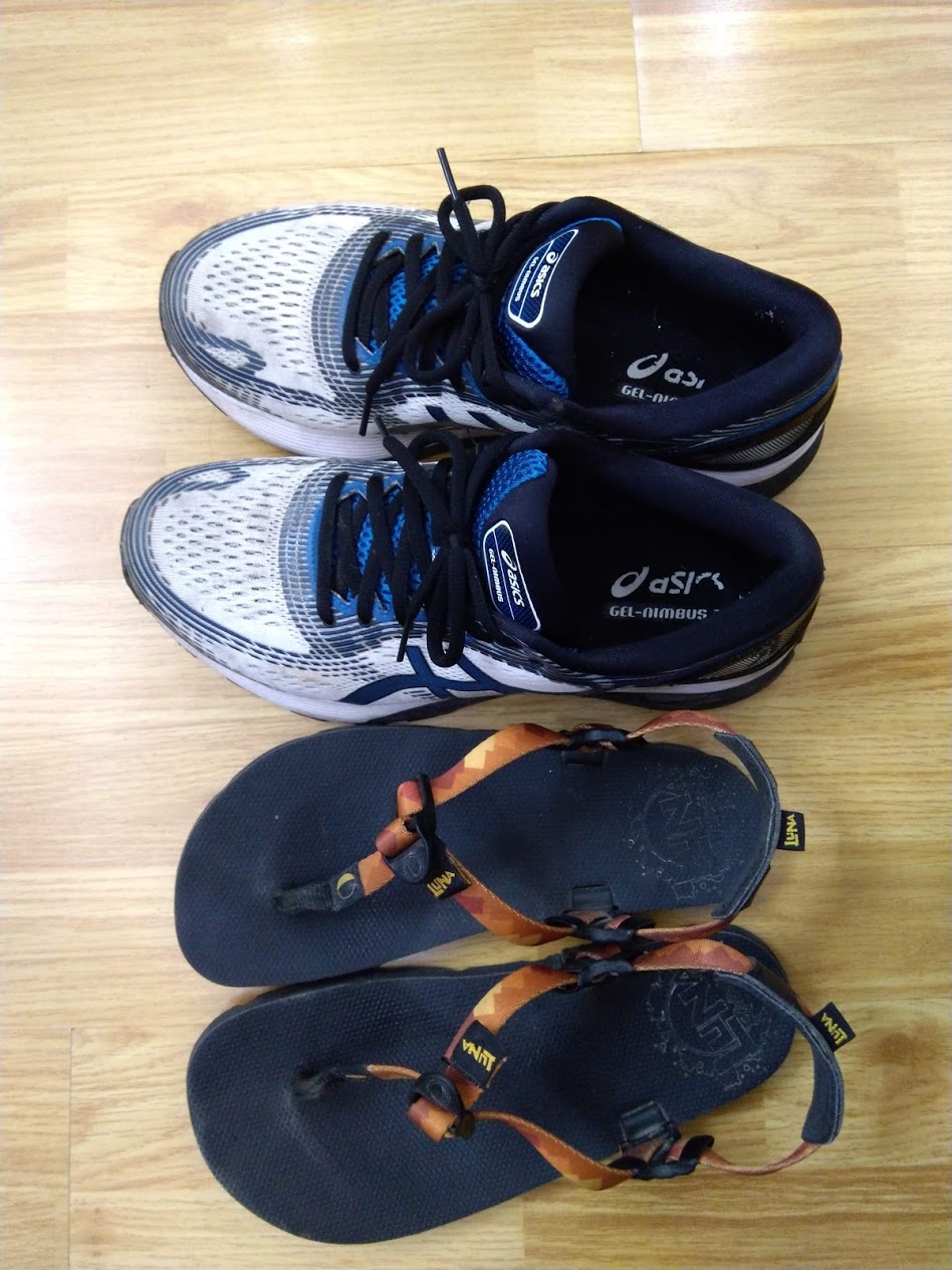 Mình trước đây chạy bằng Bitis Hunter 900k, sau đó mua thêm một đôi Kalenji 800k trong Decathlon, sau đó mua Asics Nimbus 21, sau đó có thêm Luna Mono Winged. Và giờ chỉ còn Luna và Nimbus, đã cho hai đôi cũ kia nghỉ hưu. Nóng đeo dép, lạnh đeo dép, nắng đeo dép, mưa đeo dép. Chạy dép giúp mình tiết kiệm tiền mua tất, tiết kiệm thời gian xỏ tất, cởi tất, giặt tất, phơi tất. Đôi dép đã chạy 600km, vẫn gần như mới ;)) chắc sẽ chạy được ít nhất 2000km, có anh bạn mình đã chạy dép này 4000km. Chạy nhiều tức là ít thải rác ra môi trường.