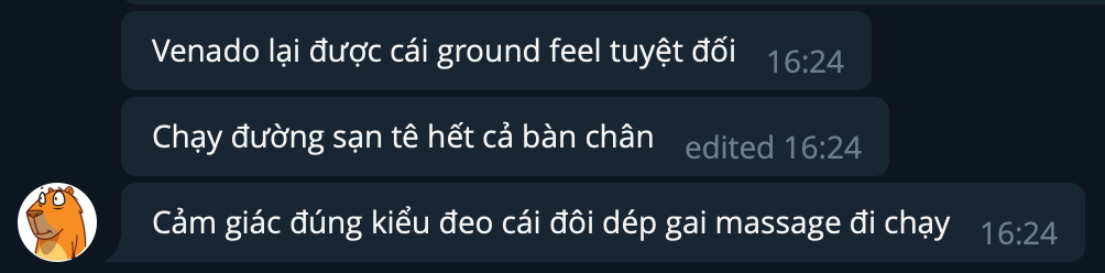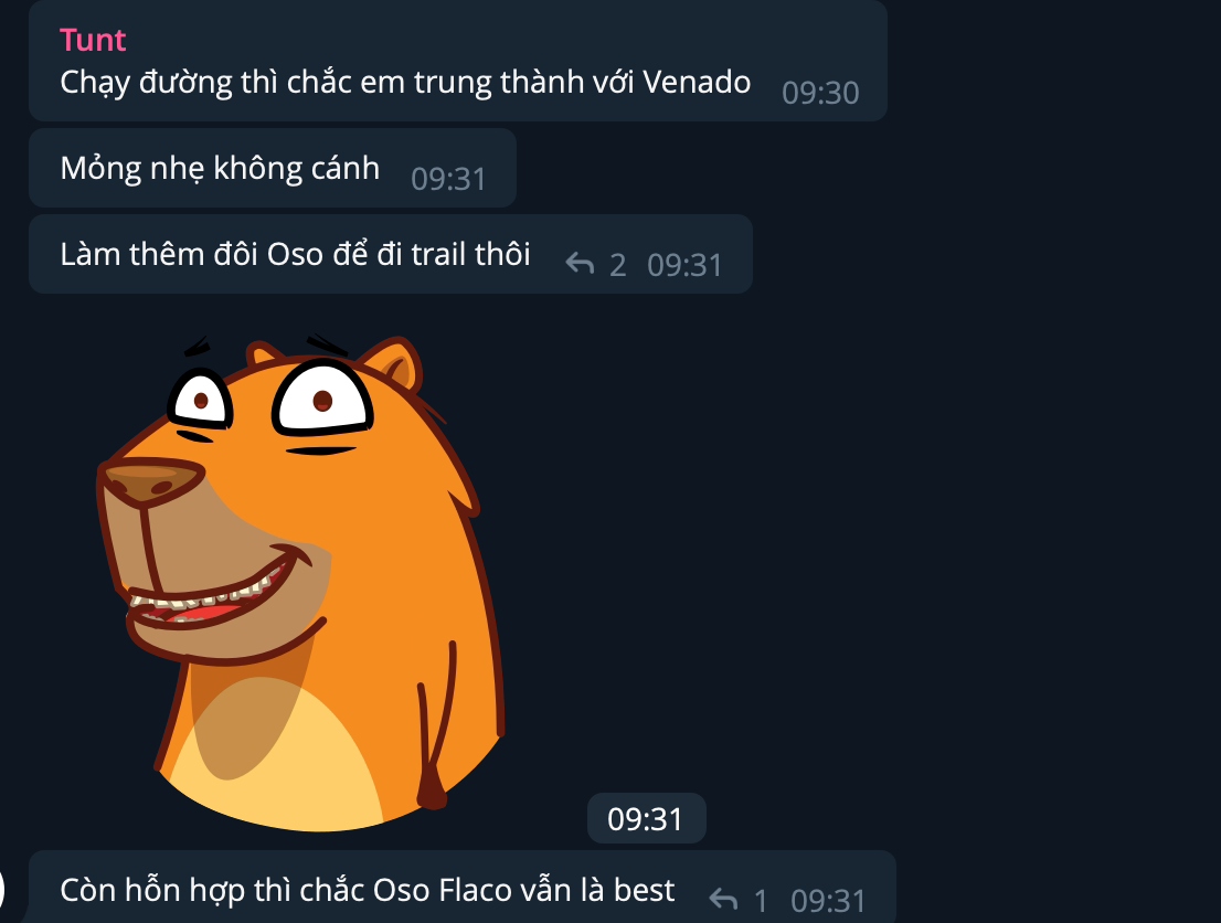 Venado như anh bạn mình review, thì chạy thật như … durex, tức là không khác mấy chân trần, cảm nhận rõ từng viên sạn nhỏ dưới đường, tức là chỉ phù hợp chạy ở nơi đường sạch đẹp. Mono mình đem đi Yên Bái Ba Vì, thoải mái, đế đủ dày để không cảm thấy như đi chân đất, và đủ mềm để không thấy đau chân hay kêu cộp cộp như đàn anh Oso. Oso thì gấu rồi, đế dưới cùng cực cứng, đảm bảo cho một tinh thần bền chắc 4000-5000km, cái này không phải nói phét, anh Tèo đã chạy Oso hơn 4000km – là oso flaco (đế mỏng hơn oso winged)